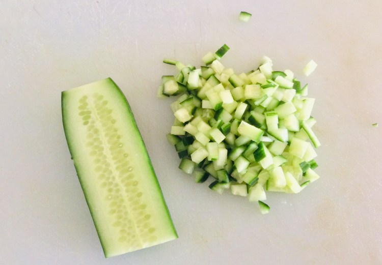 - Also dice up the cucumber, preferably without the seeds and pulp from the middle. 😊